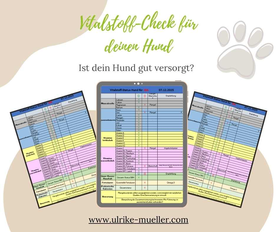 Mit der Bioresonanz-Anwendung lassen sich die Vitalstoffgruppen energetisch testen: Vitamine, Mineralstoffe, Spurenelemente, Fettsäuren, probiotische Bakterien sowie der Säure-Basen-Status. Damit wird sichtbar, welche Bereiche stimmig sind und wo ein energetisches Defizit vorliegt. Die Analyse ermittelt keine quantitativen Werte, ermöglicht aber ein strukturiertes, ursachenorientiertes Verständnis der Versorgungslage. Sie schafft eine nachvollziehbare Orientierung – besonders dann, wenn klassische Laborwerte unauffällig sind, der Hund aber trotzdem Symptome zeigt.